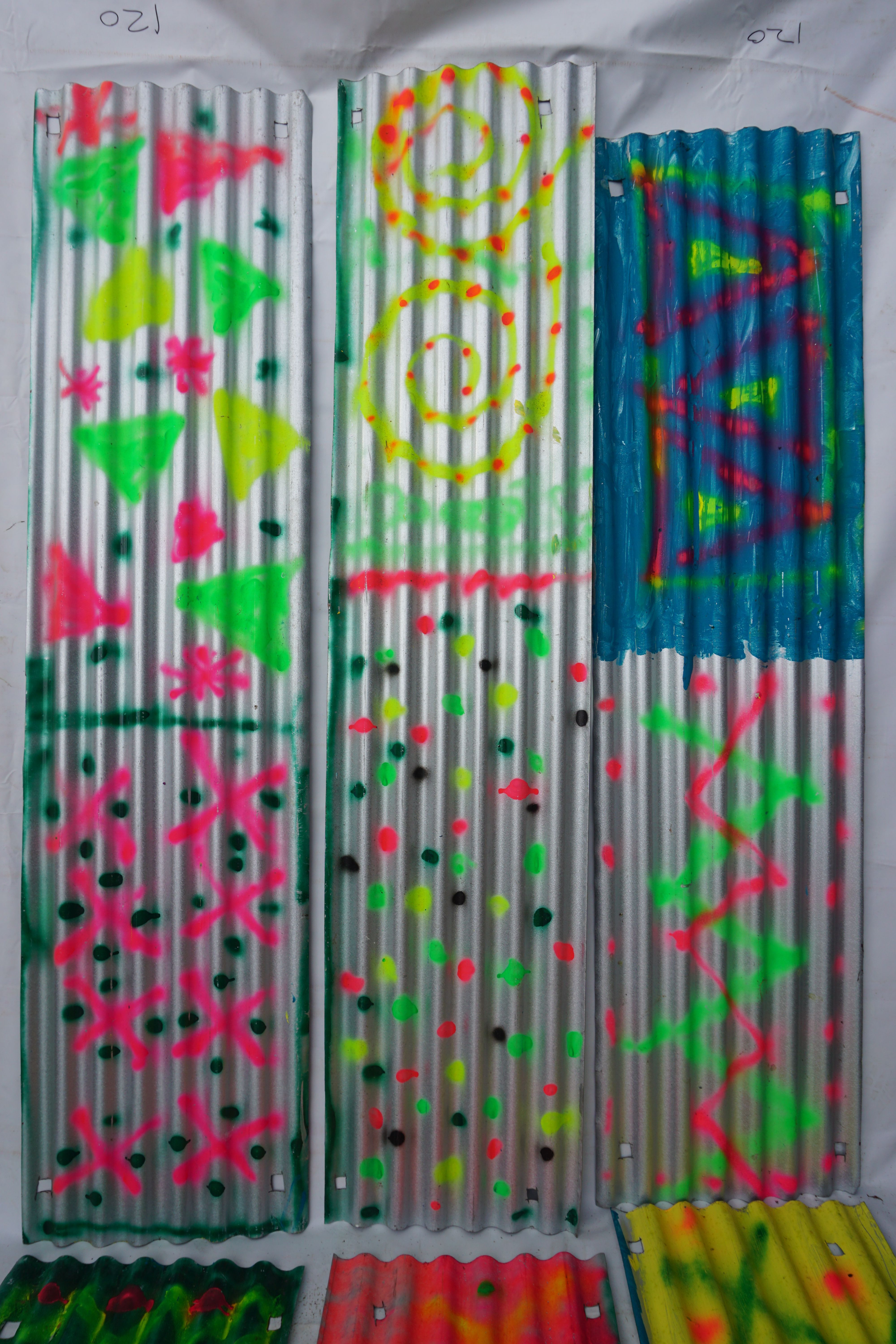 Assortiment van verschillende golfplaten met kleurrijke graffiti bespoten (6 stuks)